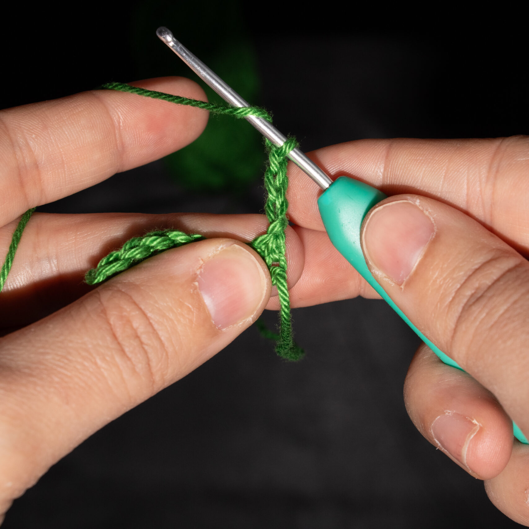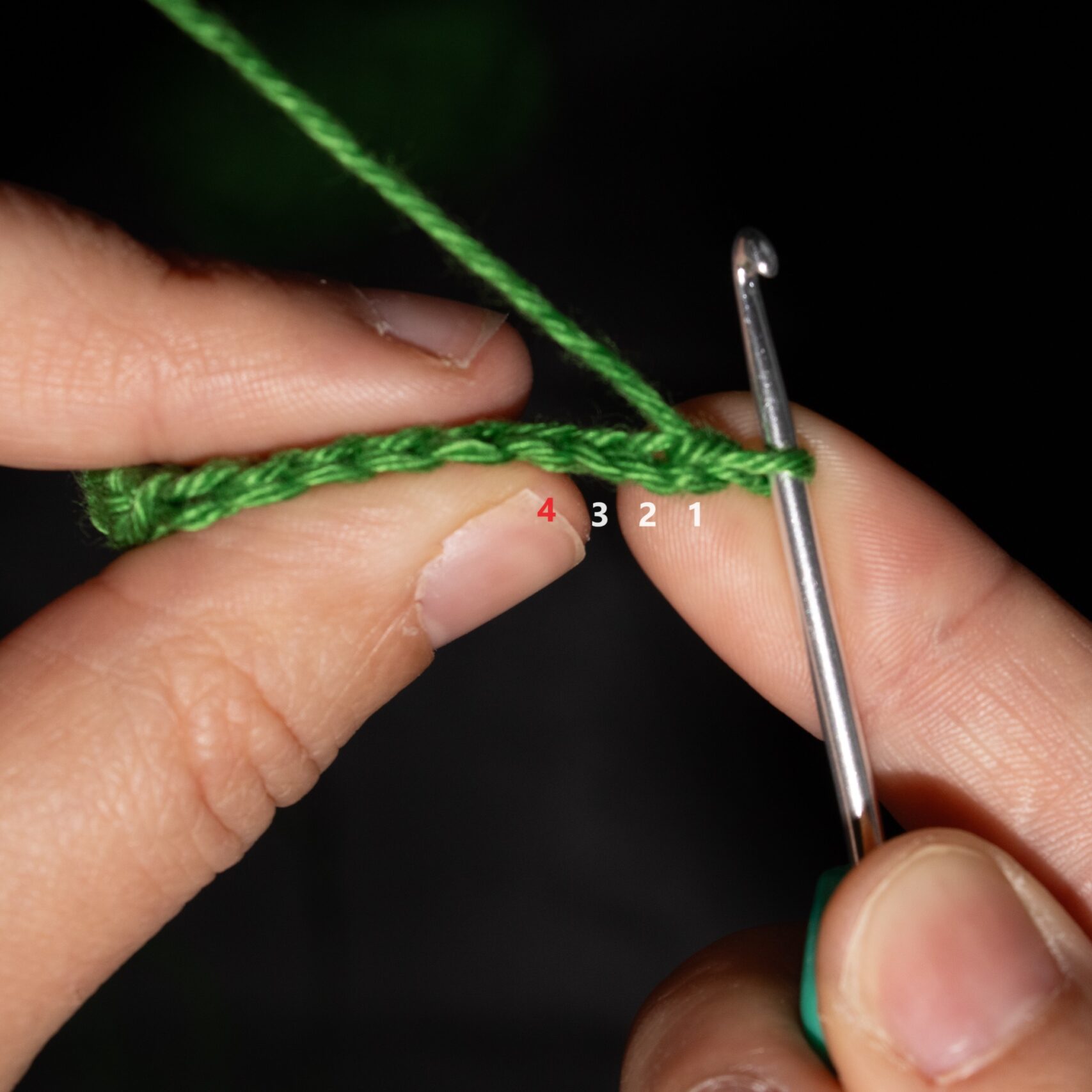 Stap 3: Steek je haaknaald door de 4e steek vanaf je haaknaald gezien en sla de draad om je haaknaald.