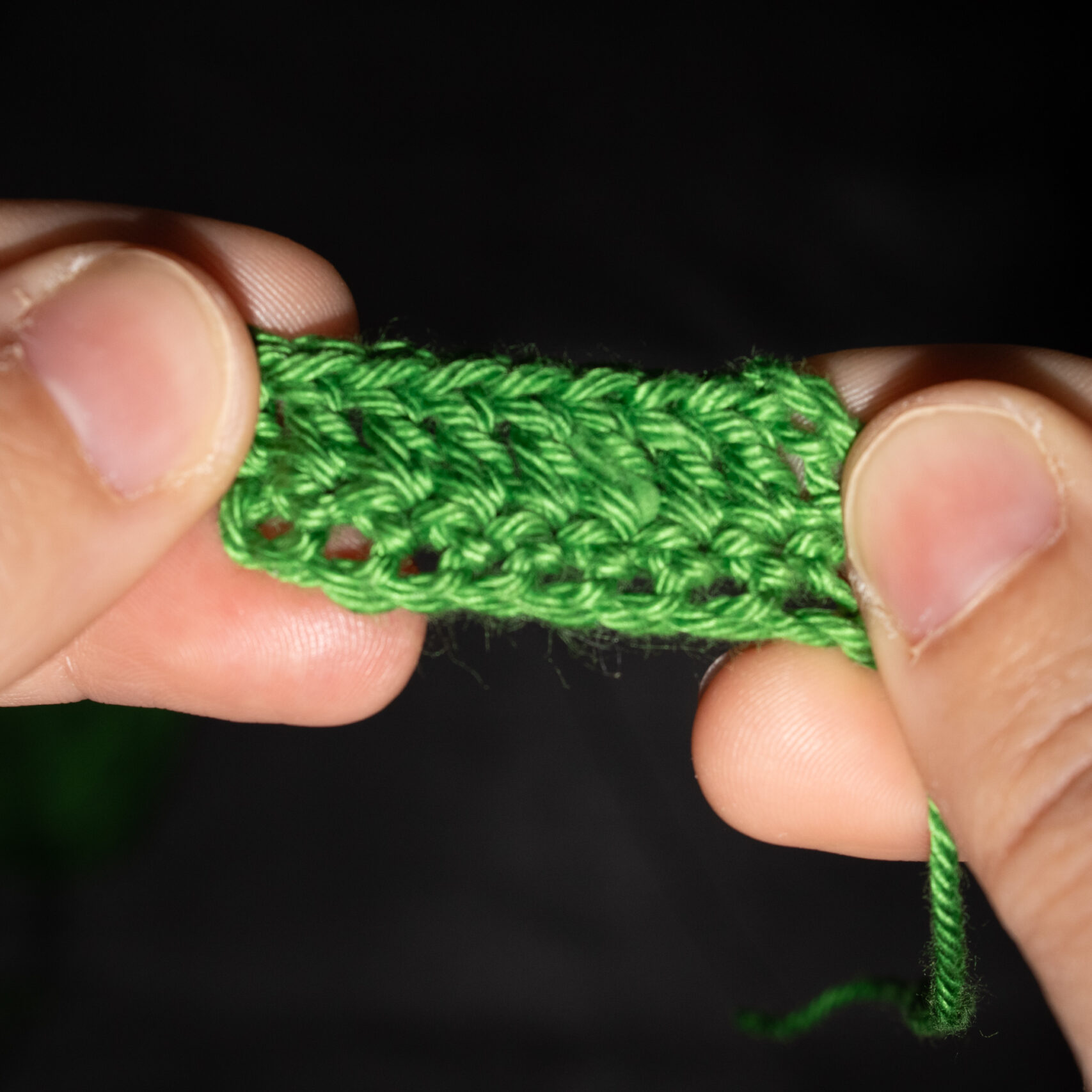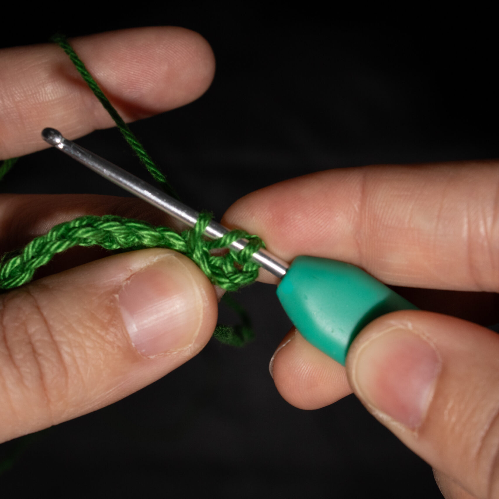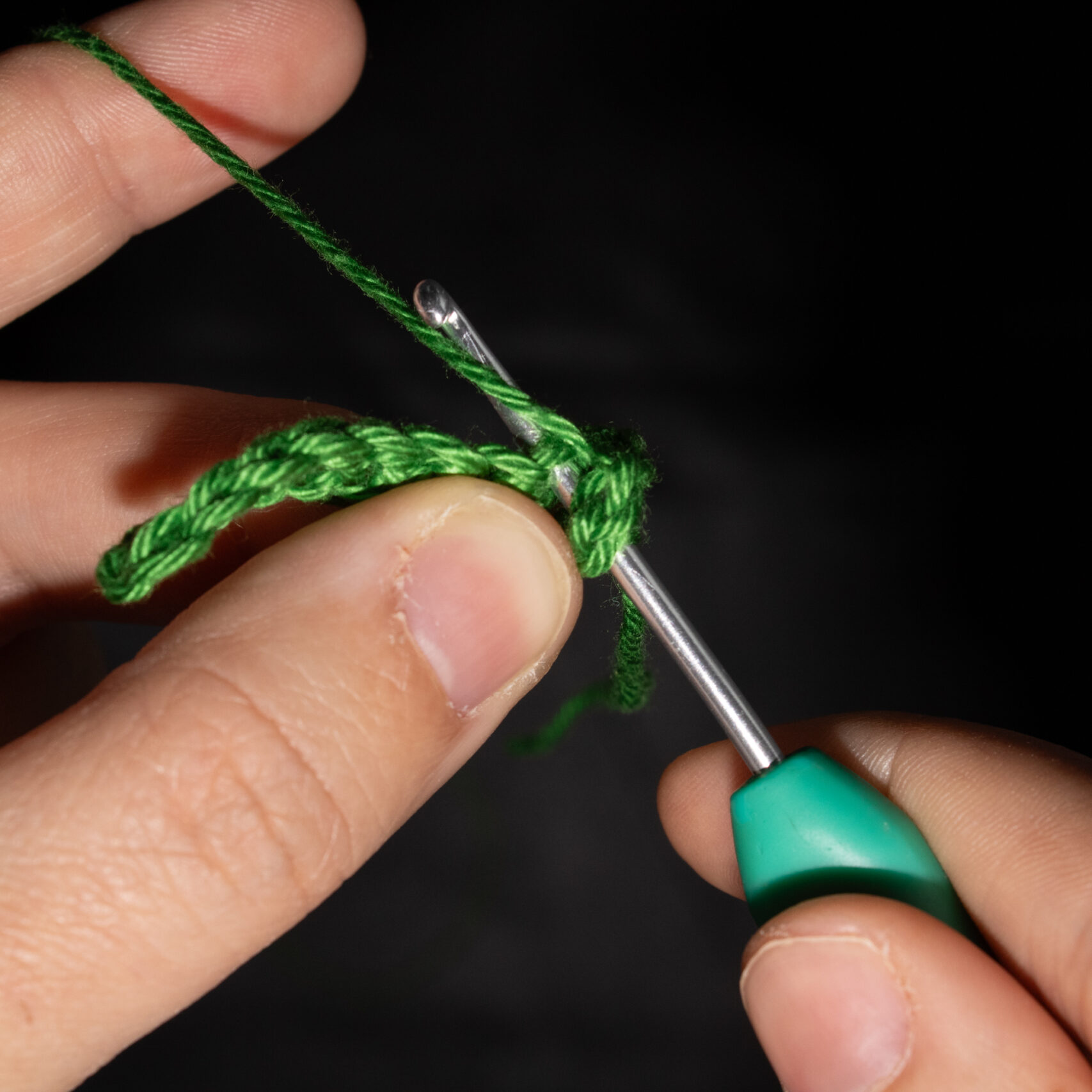 Stap 7: Trek de draad door beide lussen die nog op je haaknaald zitten. Je hebt nu nog één lus op je haaknaald. Trek aan. Je hebt nu een stokje gehaakt.