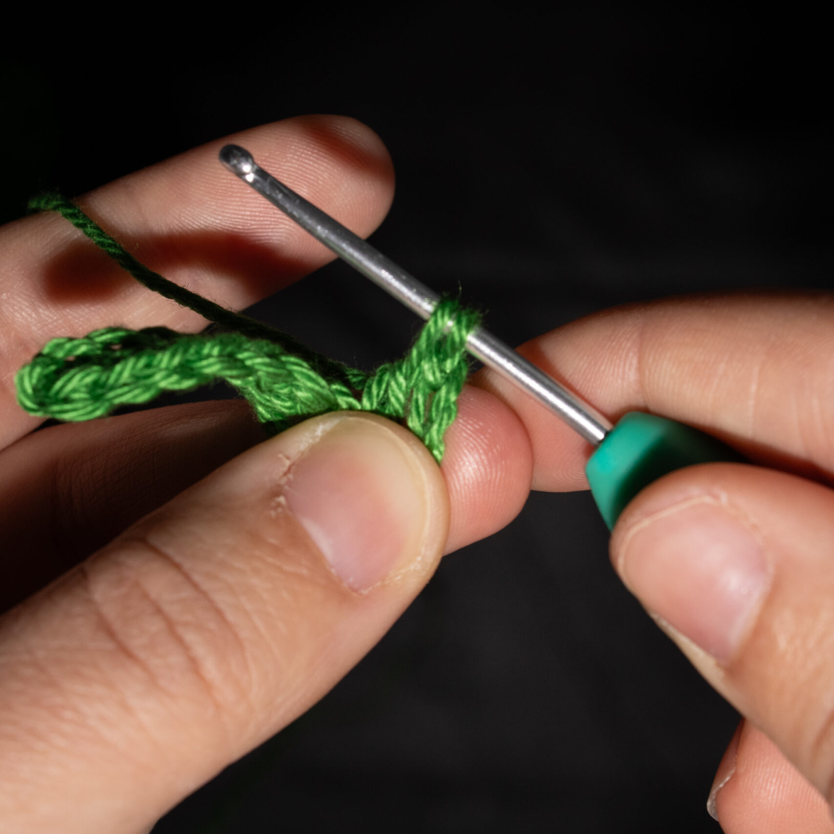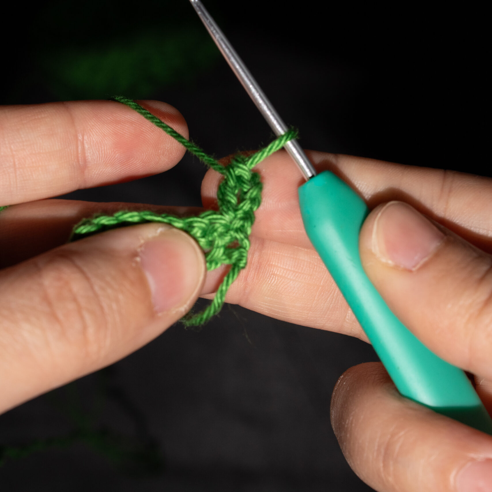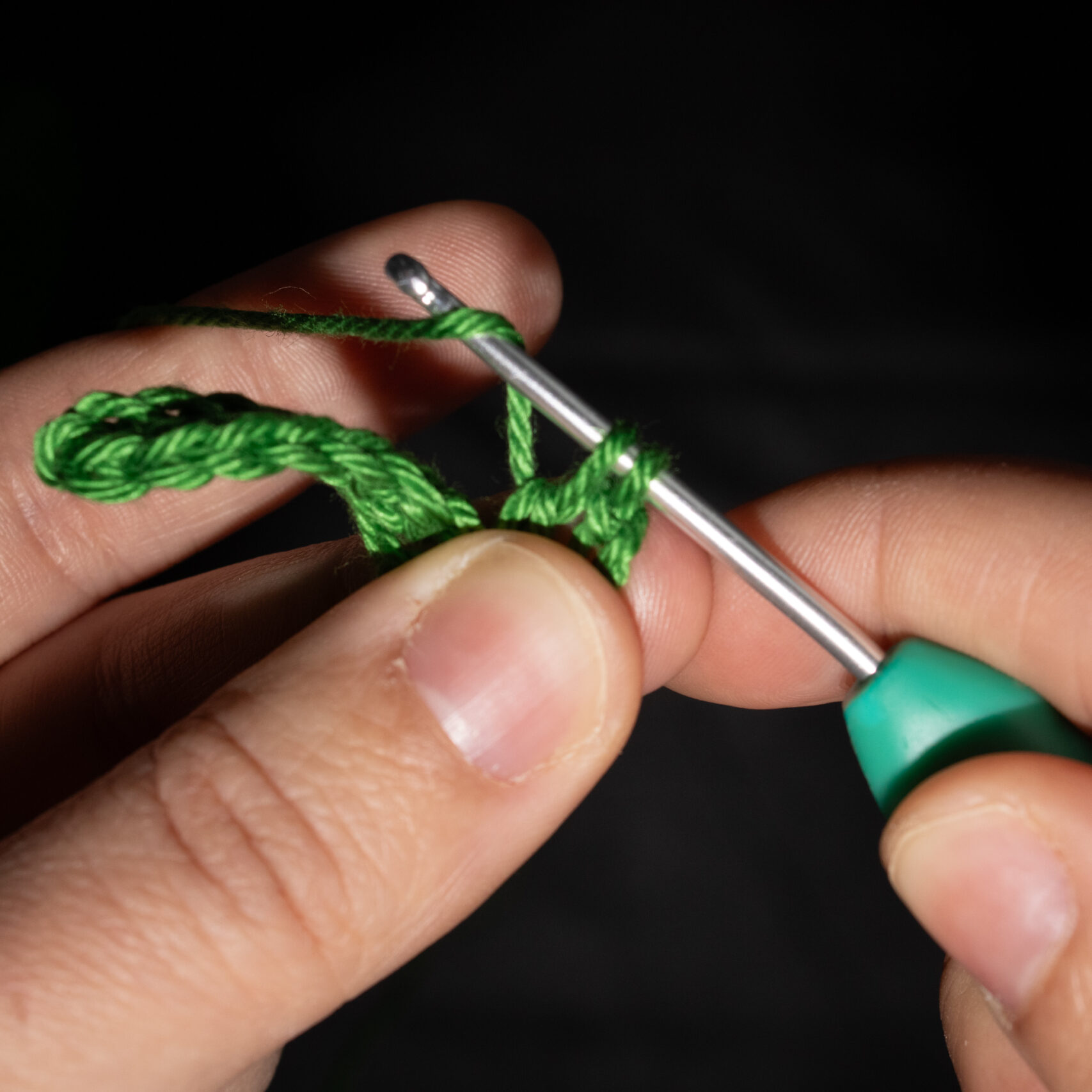 Stap 1: Voor je begint met je stokjes te haken, haak je, tenzij in het patroon anders aangegeven, drie lossen. Dit telt als je eerste stokje. Je begint dus in de 4e steek vanaf je haaknaald gezien.