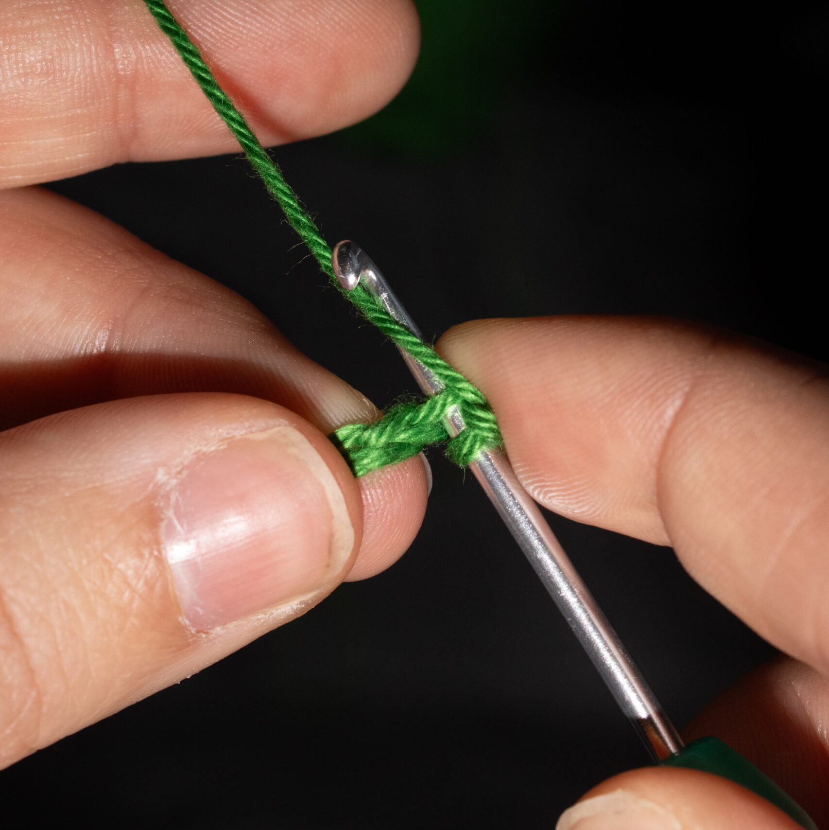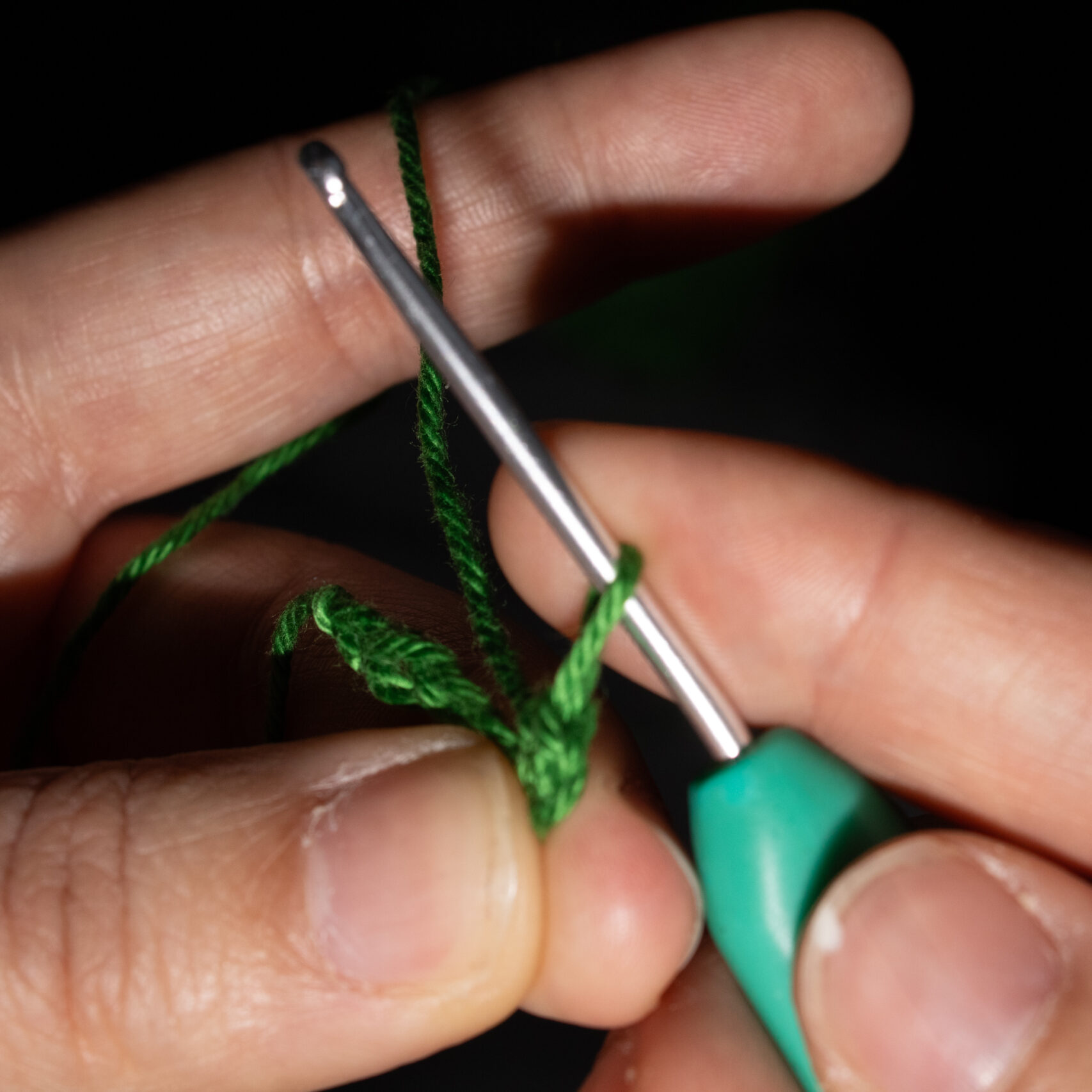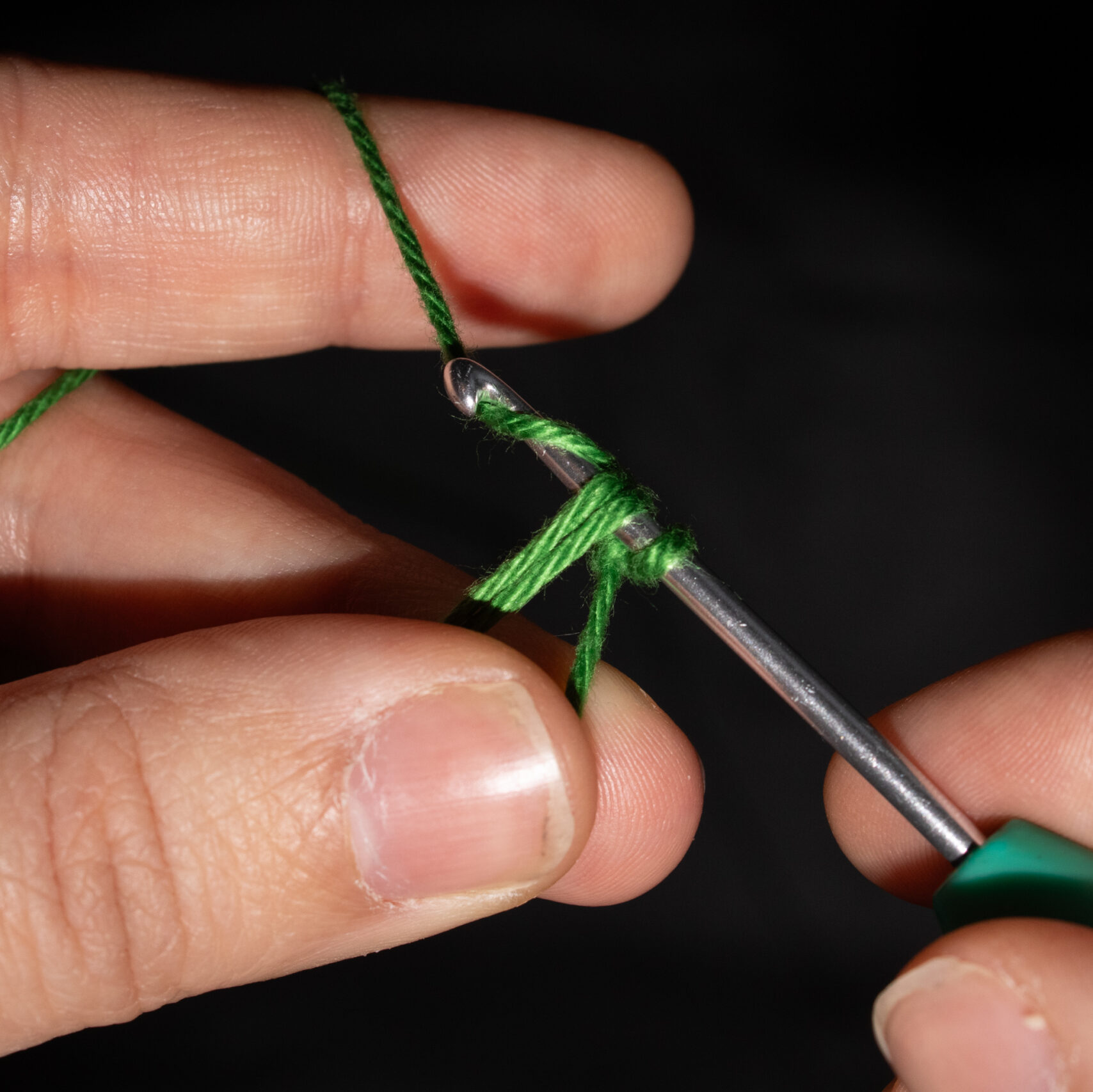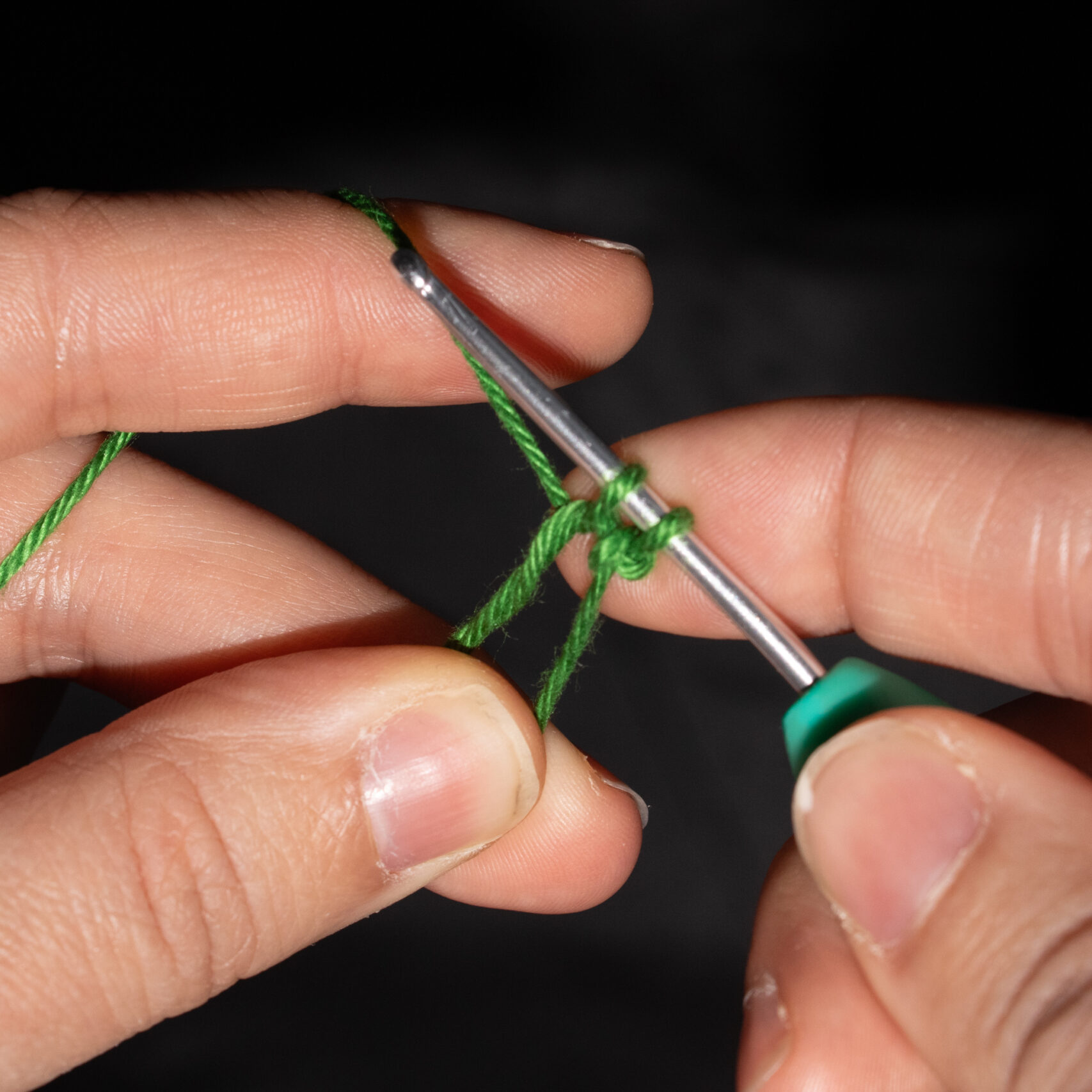 Stap 2: Trek de draad door de losse heen. Je hebt nu twee lussen op je haaknaald. Sla de draad achterlangs je haaknaald. Je haaknaald wijst weer naar links, of iets naar jezelf toe.