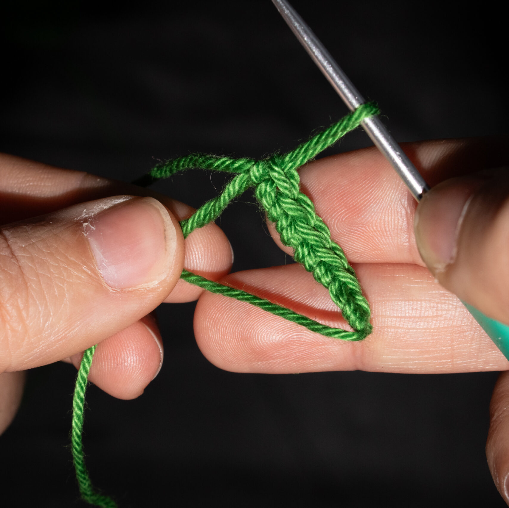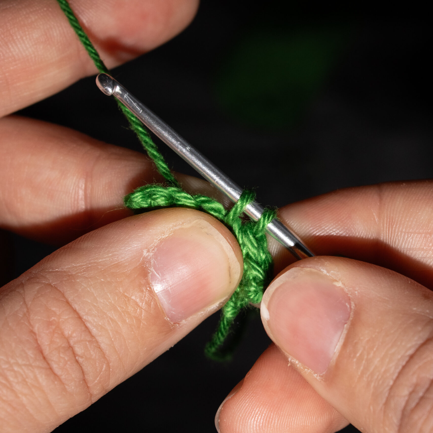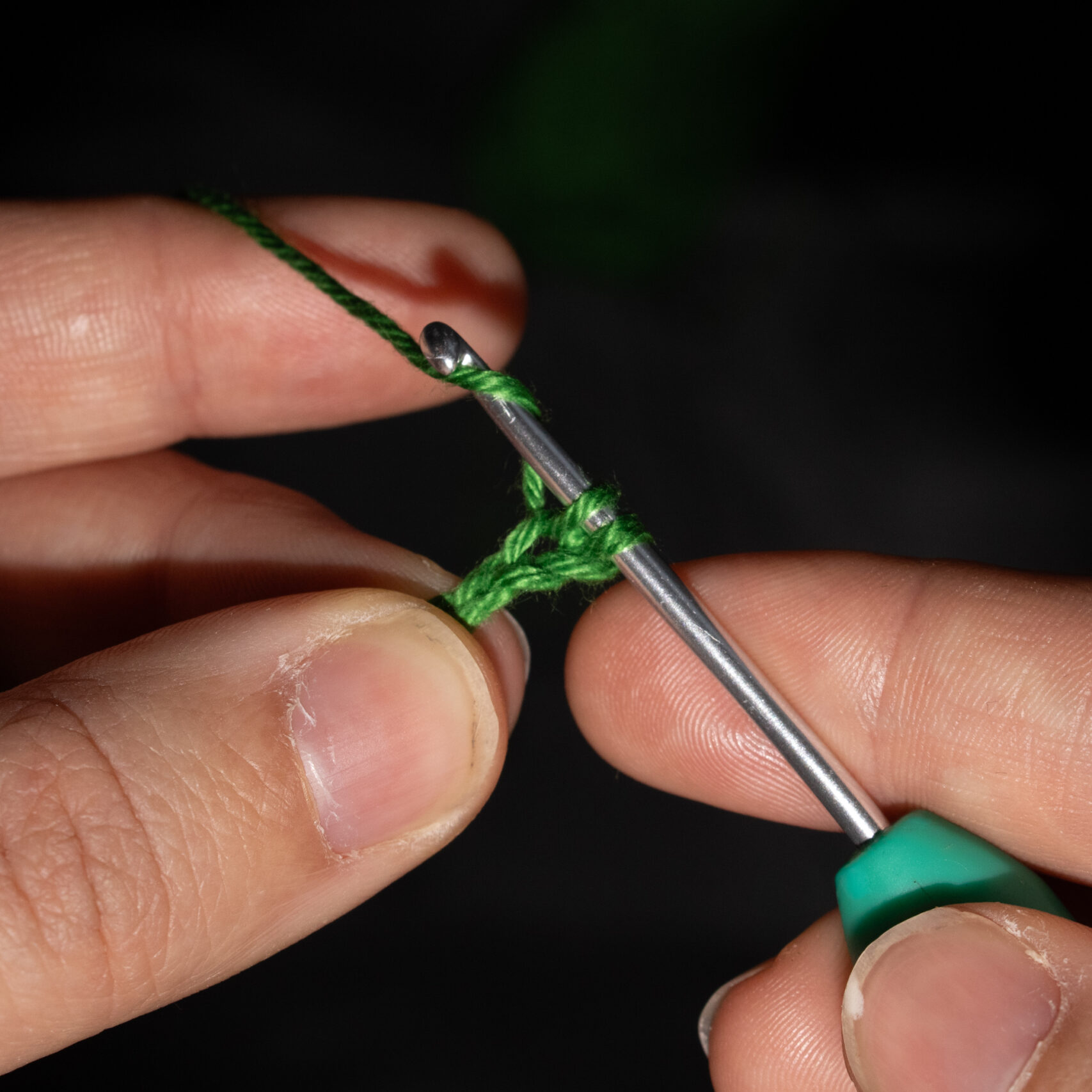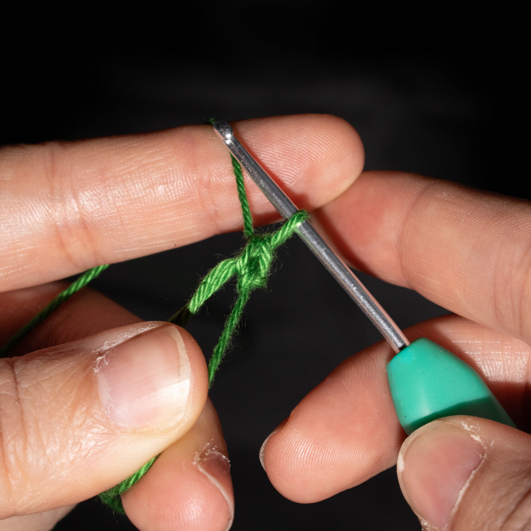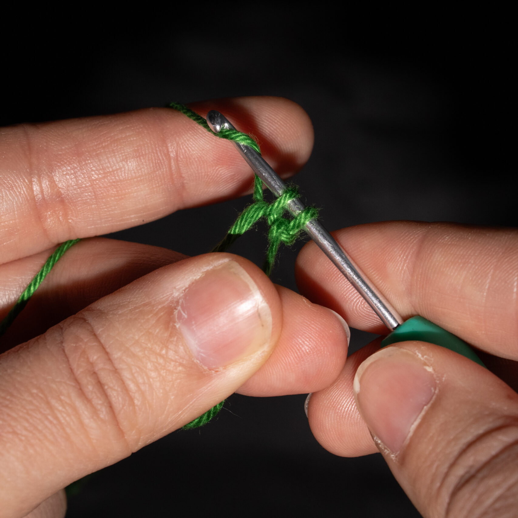 Stap 2: Trek de draad door de losse heen. Je hebt nu twee lussen op je haaknaald. Sla de draad achterlangs je haaknaald. Je haaknaald wijst weer naar links, of iets naar jezelf toe.