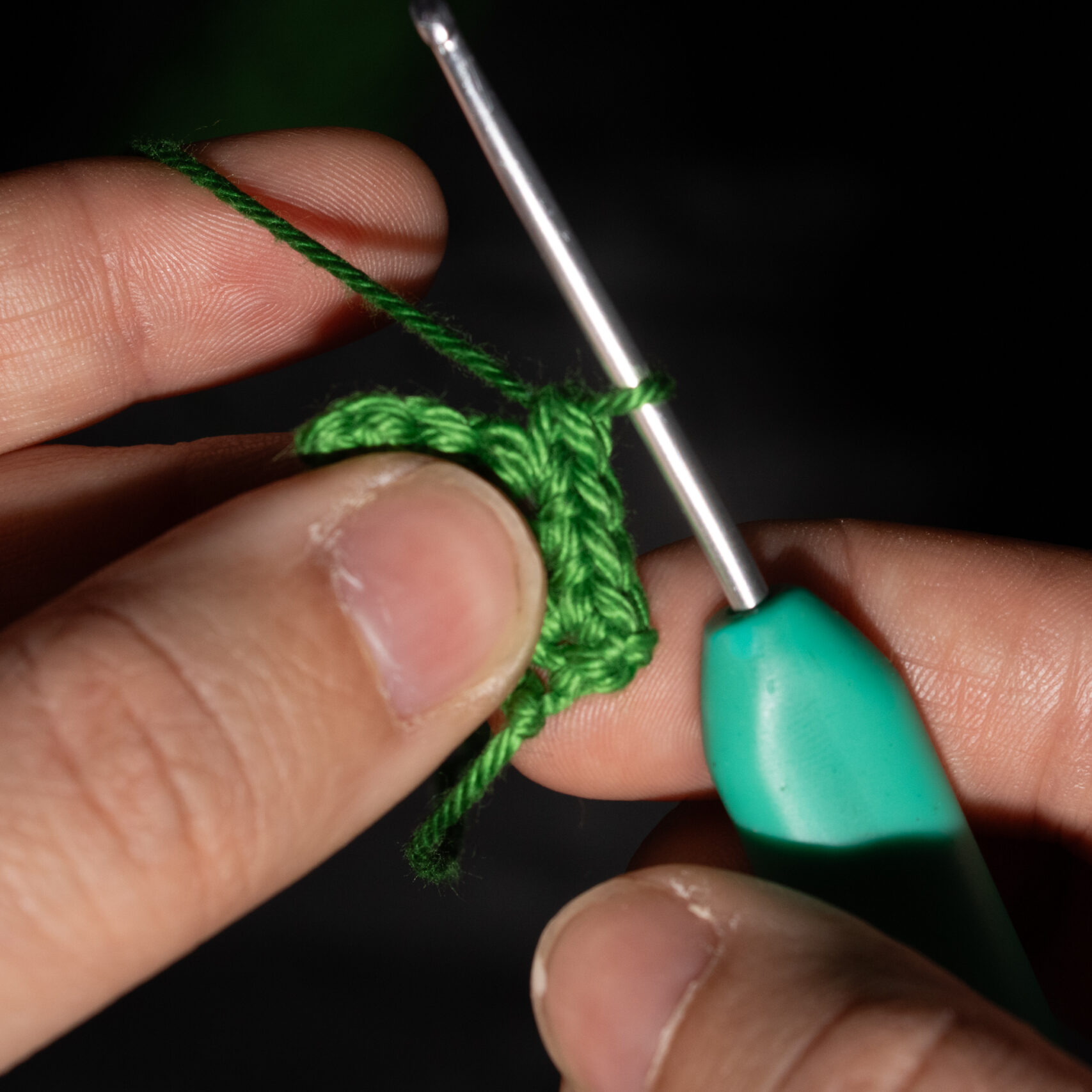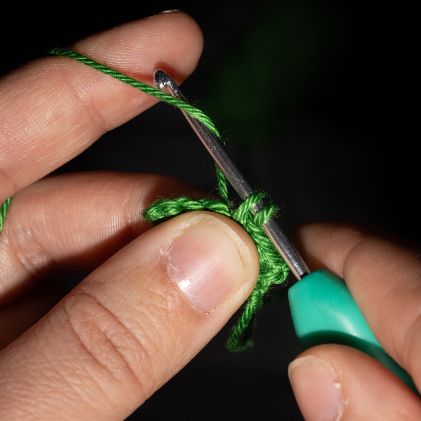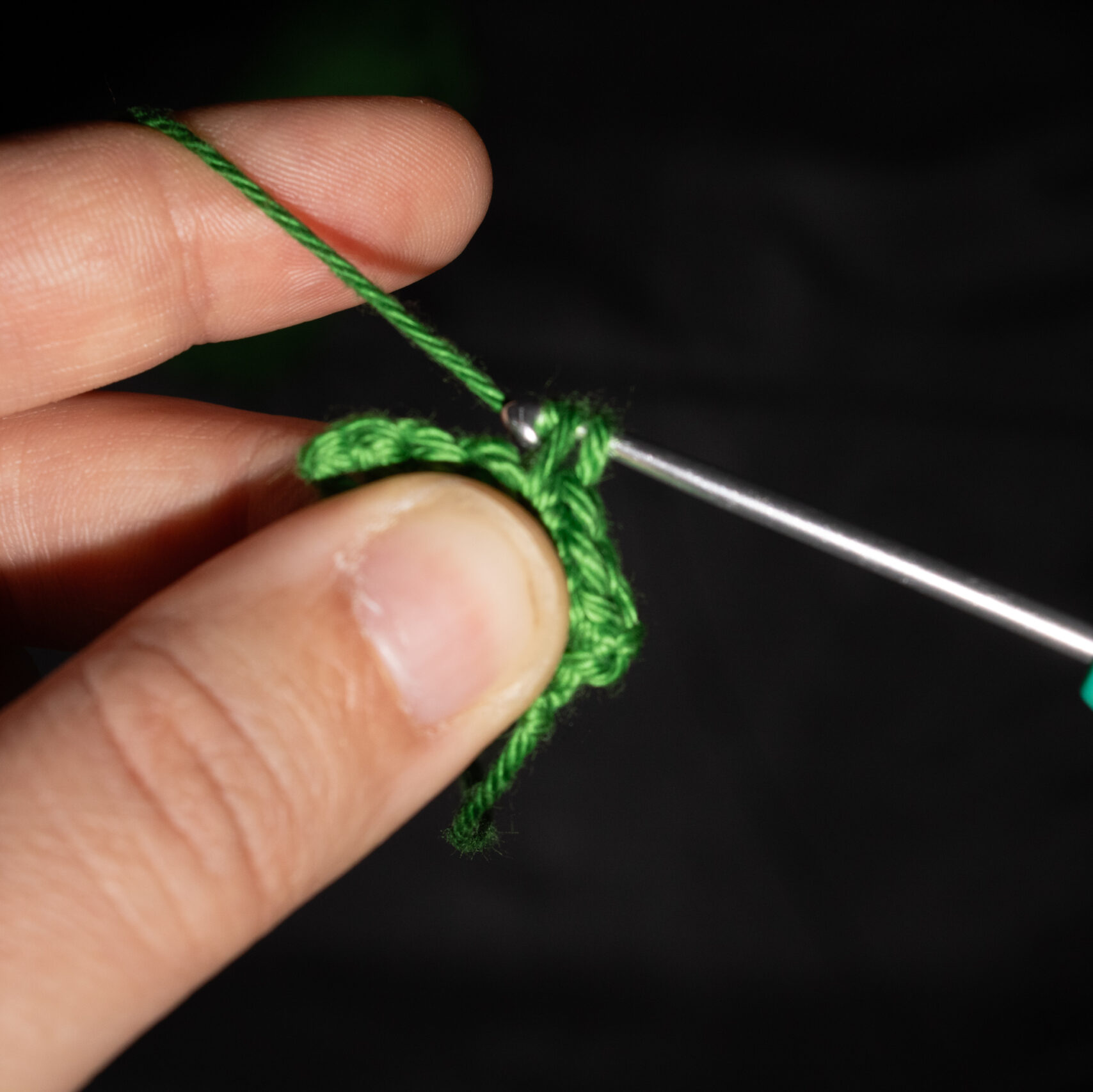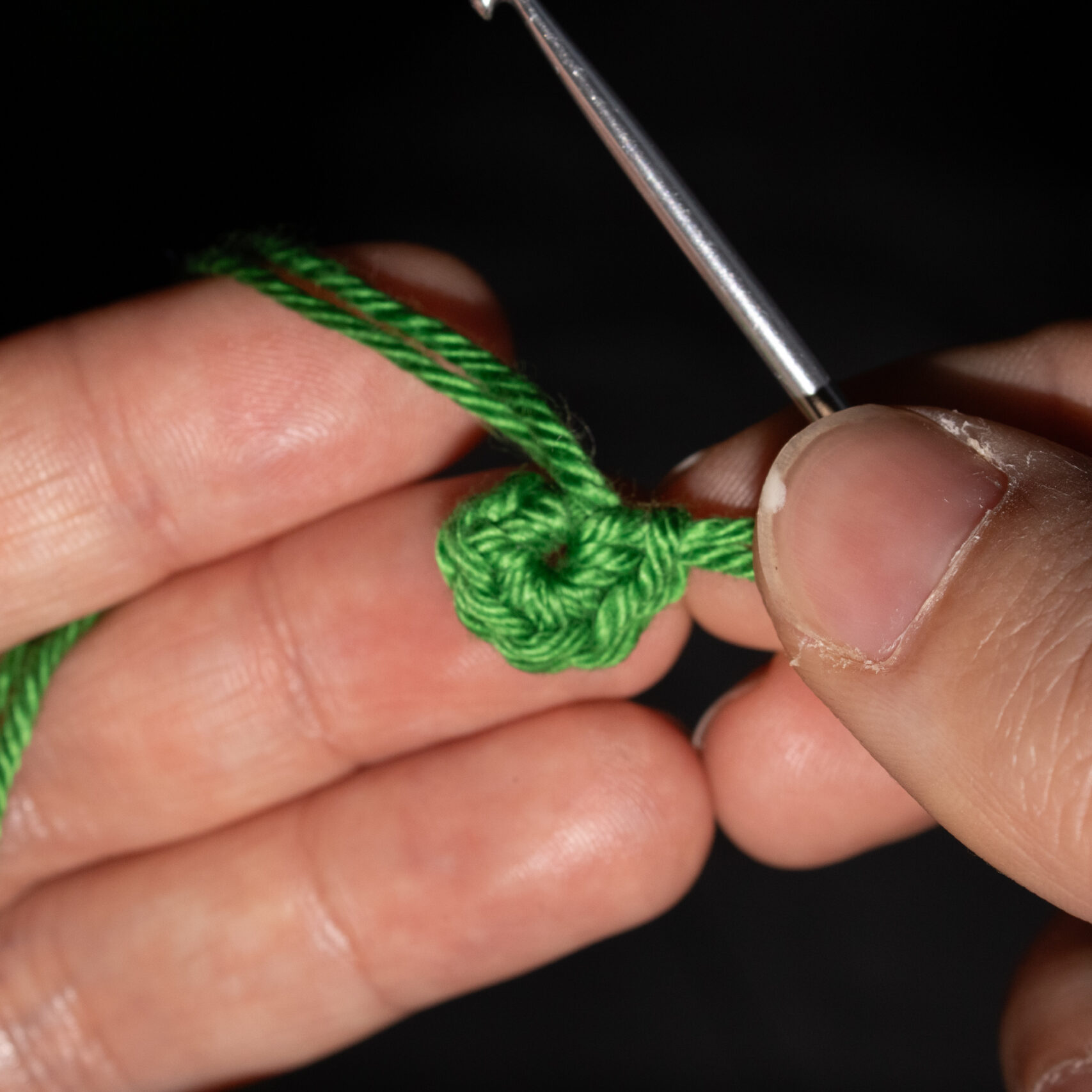Stap 1: Steek je haaknaald door het midden van je magische ring en sla je draad om je haaknaald. Tijdens het haken houdt je met je duim en middelvinger van de hand waarmee je je garen vasthoudt ook de magische ring vast, zodat je werk strak gehouden wordt.