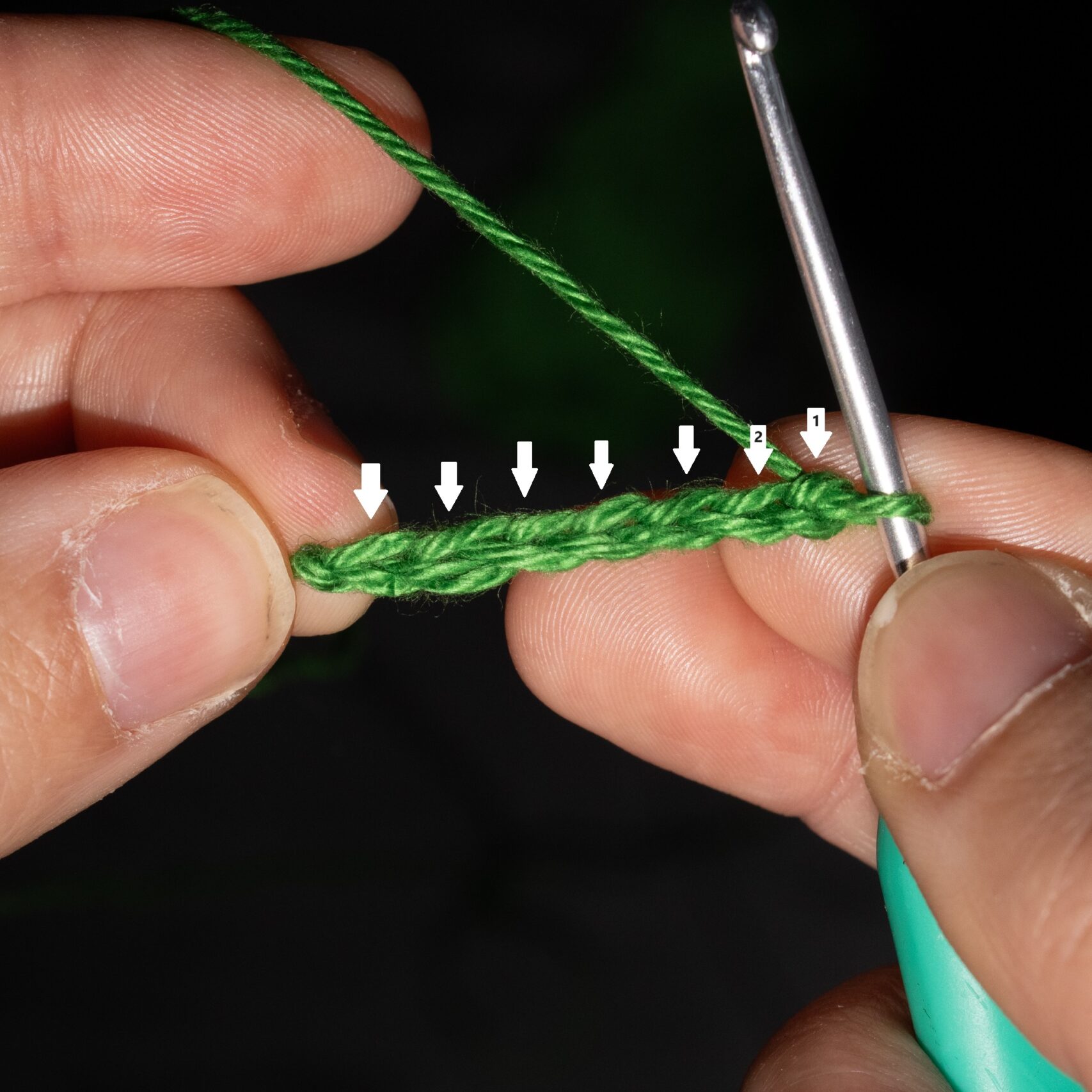 Stap 1: We beginnen dus vanaf de 2e losse vanaf je haaknaald (pijltje met een 2 erin in afbeelding hiernaast). Steek je haaknaald door de losse. Je steekt enkel onder het bovenste beentje door, je ziet dat er maar 1 draadje over je haaknaald zit. Sla de draad bovenlangs om je haaknaald. Je haaknaald wijst naar links, of iets naar jezelf toe.