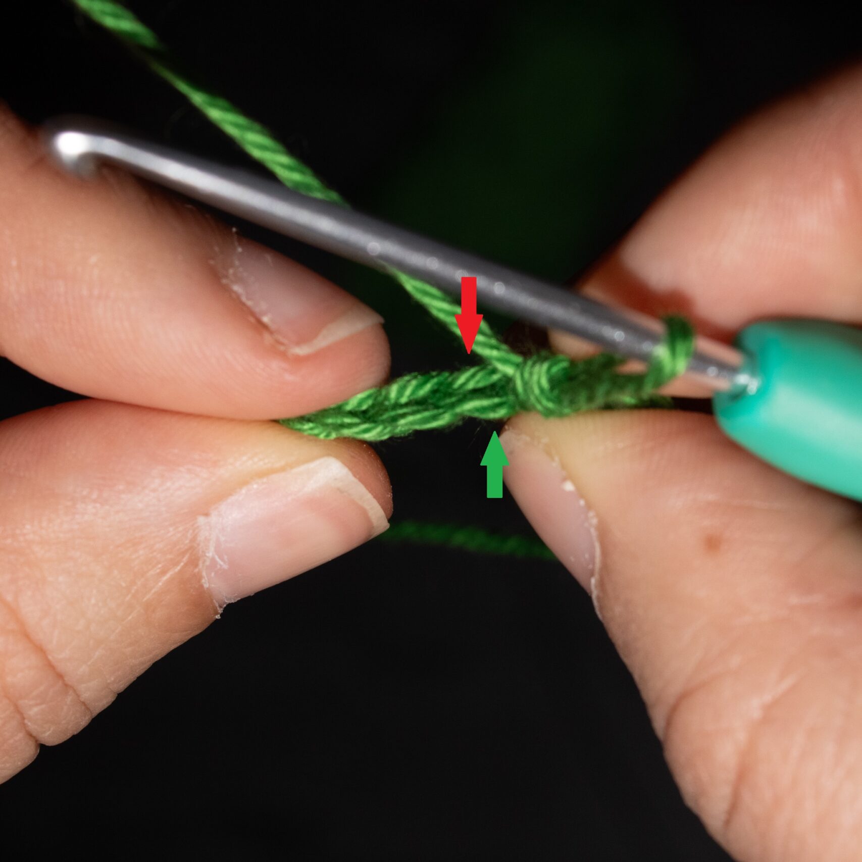 Stap 1: Kijk naar de steek waarin je de volgende vaste gaat maken. Een vaste steek bestaat uit twee ‘pootjes’, die in een ‘v’ lopen (zie rode en groene pijl). Het pootje naar je toe is de voorste lus (hier groene pijl), het pootje van je af is de achterste lus (hier rode pijl).