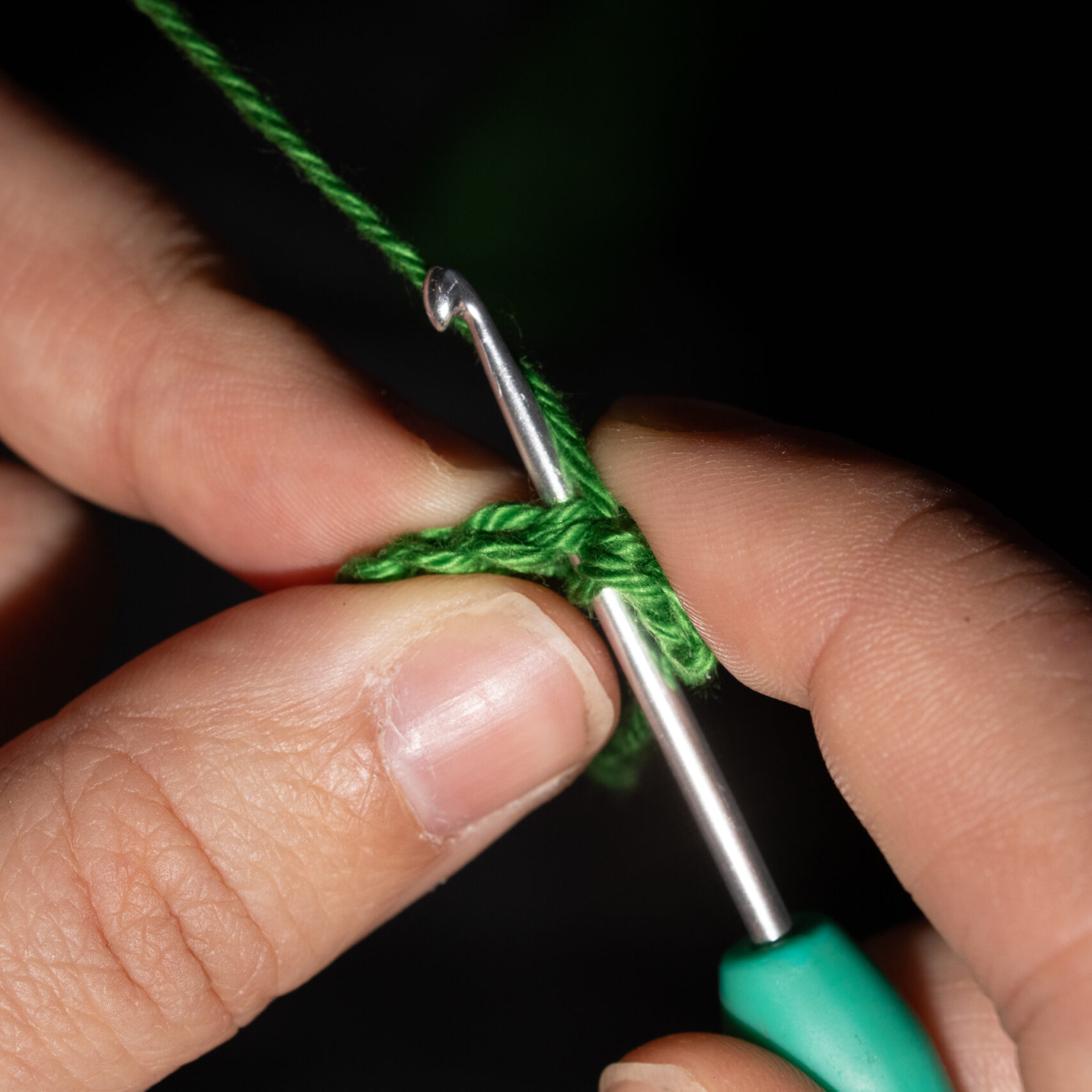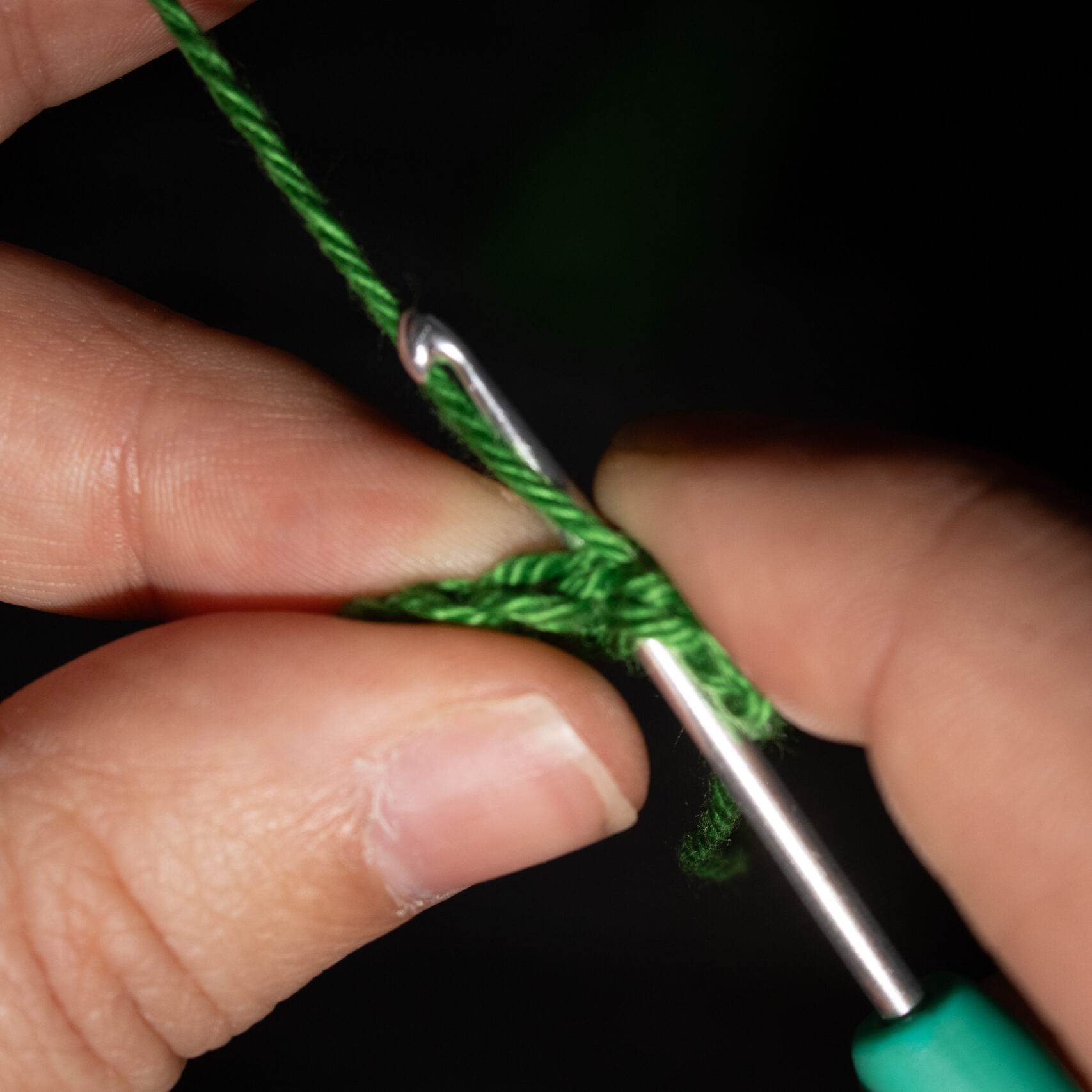 Stap 7: Trek de draad volledig door de twee lussen heen en trek aan. Je hebt nu nog 1 lus op je haaknaald. Gefeliciteerd, je hebt een vaste gehaakt!